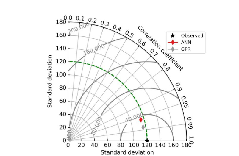 Taylor diagram is plotted in between the correlation coefficient, standard deviation and RMSE. Fig. 8 shows the graphical representation of the performance of the ANN and GPR model. Dotted green line in the Fig. 8 is the “reference” line based on the measured value of the dataset. Based on the performance indices and the Taylor diagram it is concluded that the performance of the GPR model is higher as compared to ANN model.