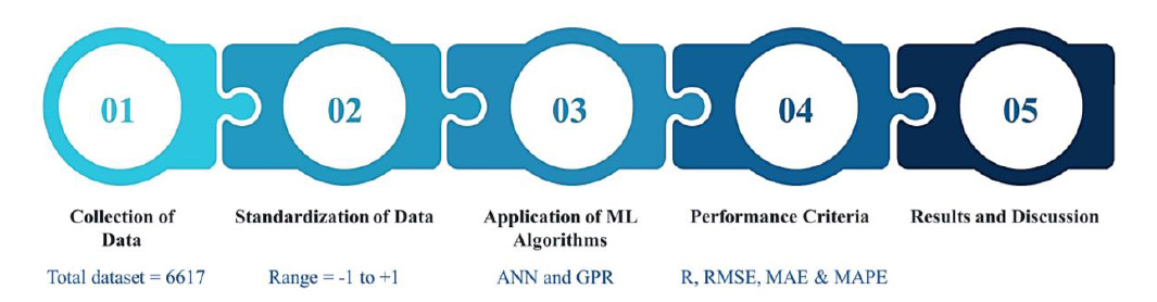 The Gaussian assumption and the marginalization feature of the Gaussian process, which presupposes that the joint distribution is Gaussian, may be used to derive the predictive distribution from this. 10-fold cross-validation process was used to validate the results of GPR model.Regression using Gaussian processes necessitates choosing a covariance function. A approach to incorporate past knowledge of the phenomenon into the study is through the covariance function and certain of its parameters. Equation 9 shows the so-called squared exponential covariance function is used in this study. The stationary squared exponential covariance function's structure puts a focus on nearby locations. Thus, the local behaviour of a smooth function is comparable.