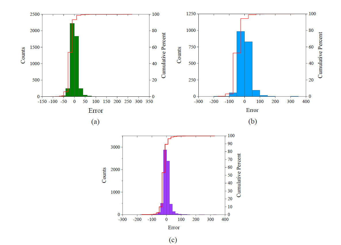 Fig. 10. Error frequency histogram of GPR model (a) Training dataset (b) Testing dataset and (c) All dataset.
