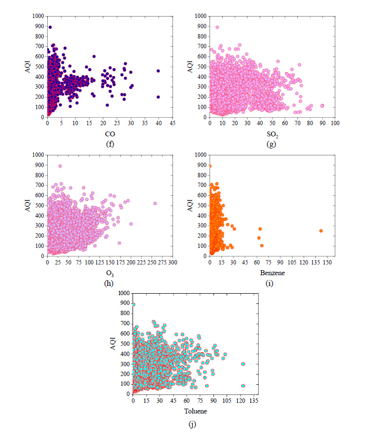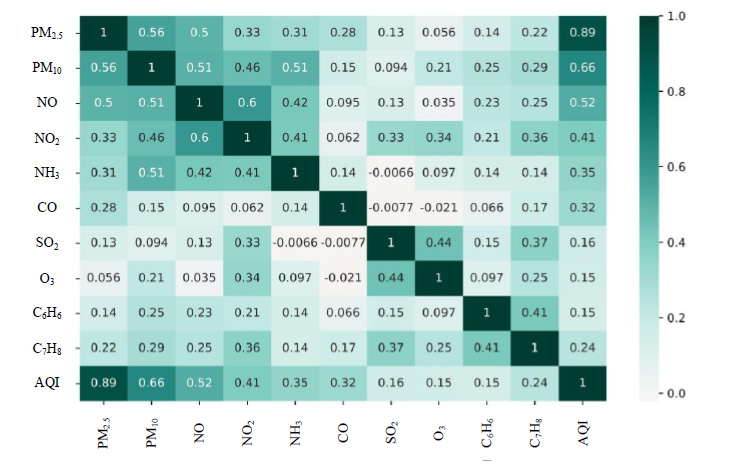 The correlation coefficient (R) values of the output and input parameters are presented in Fig. 3. The maximum value of R is in between PM2.5 and AQI and the worst correlation is found in between CO and AQI as shown in Fig. 3.