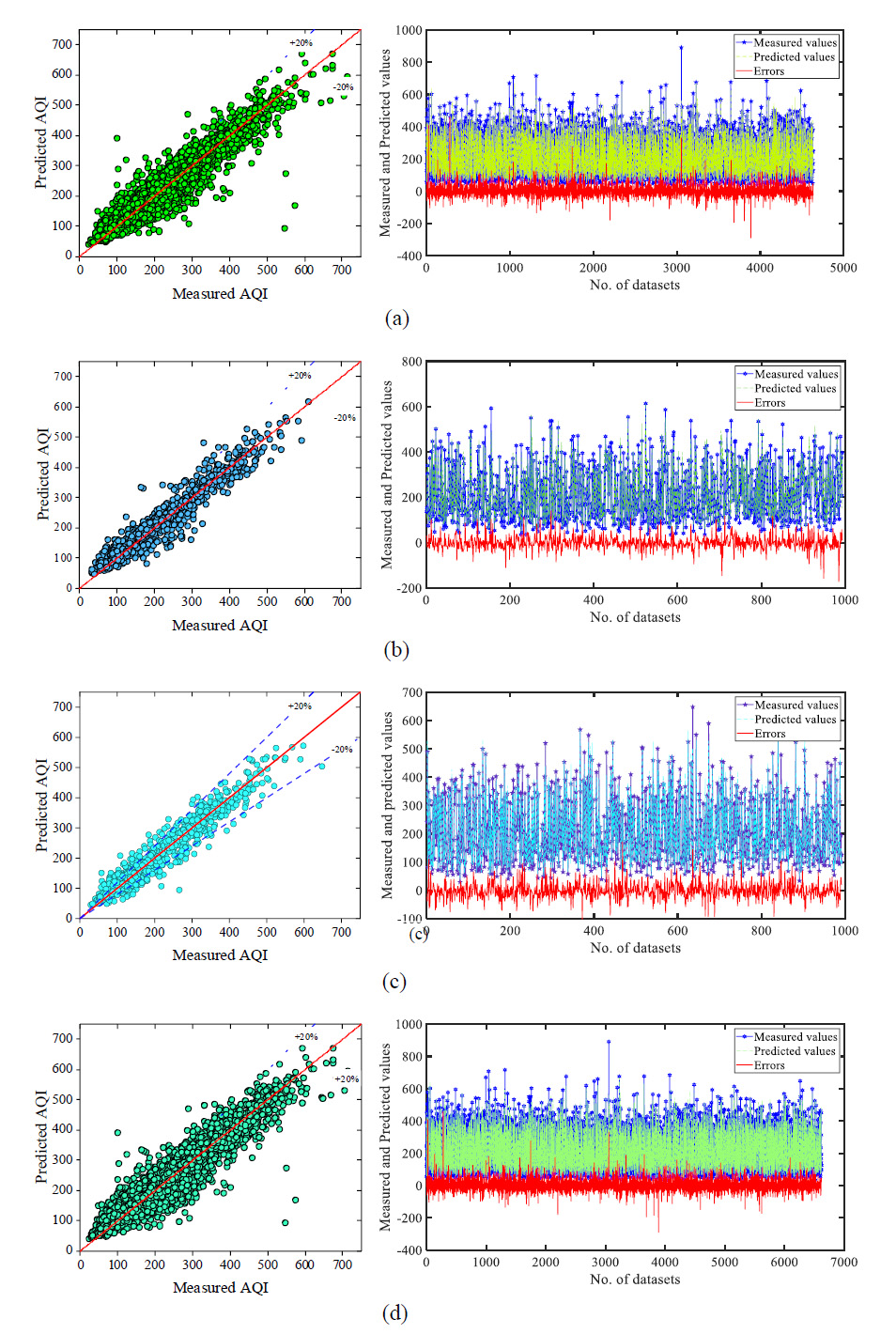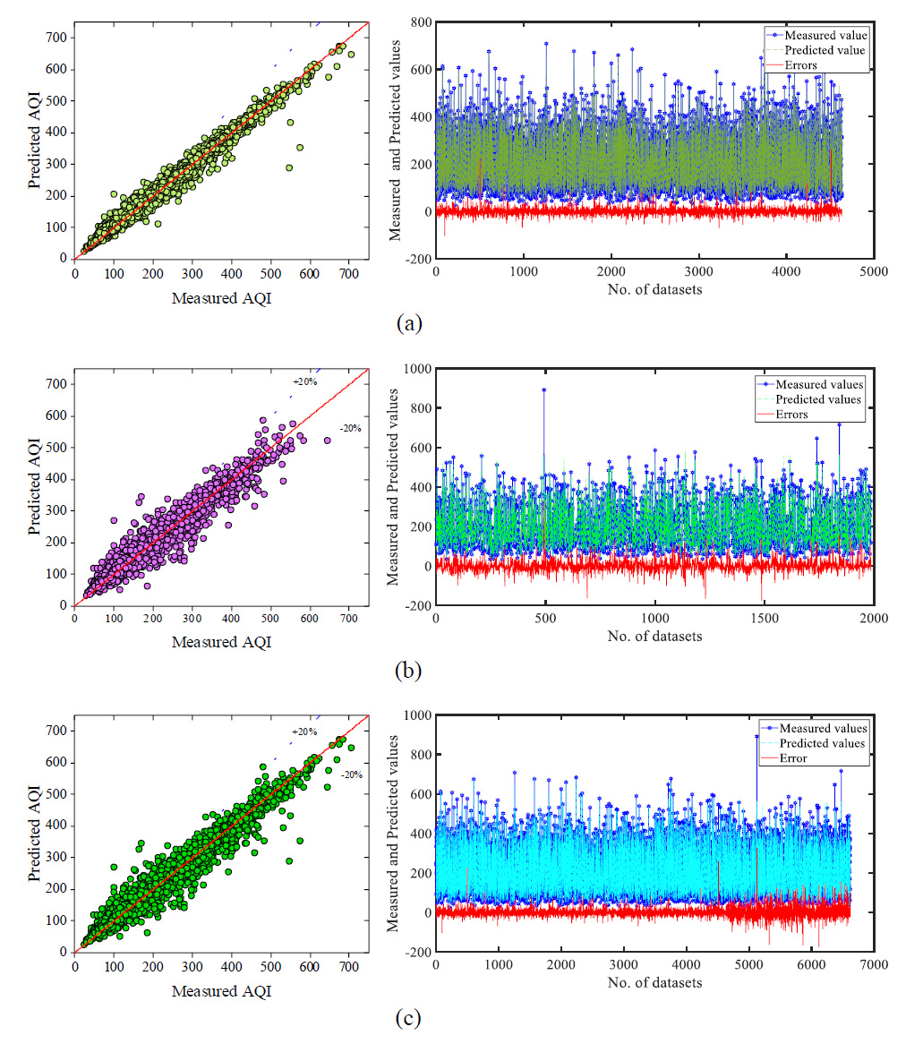 Auto Regressive Integrate Moving Average (ARIMA) as a time series model, Principal Component Regression (PCR) as a hybrid regression model, combination of ARIMA and PCR as the first ensemble model and, the combination of ARIMA and Gene Expression Programming (GEP) as the second ensemble model. Observed AQI during the years 2012 to 2015 was utilized to train models. According to the results, nonlinear ensemble model is considered as the best model for predicting AQI in all seasons. The maximum negative and positive errors, Mean Absolute Percentage Error (MAPE), and statistical parameters, including the coefficient of determination, root mean square error (RMSE), normalized square error (NMSE), and fractional bias, were utilized to evaluate and compare models [ 35 ].These models are autoregressive conditional heteroscedasticity (GARCH), autoregressive integrated moving average (ARIMA), and the combination of ARIMA and GARCH by multiple linear regression (MLR) technique (model 3). Correlation coefficient, root mean square error (RMSE), normalized square error (NMSE), and fractional bias, are calculated to evaluate the accuracy of each model. ARIMA and model 3 can predict future earthquake magnitude better than other models [ 10 ].The neuron in the ANN algorithm has been studied from 3 to 12 number. To quantify the performance of each ANN model at each individual neuron, the performance indices R and MSE for training, testing, and validation datasets are utilized. According to Table 3, neuron 9 has the greatest R value and the lowest MSE value, as well as the lowest rank among all the neurons, as presented in Table 3. The R, RMSE, MAPE, and MAE values of the ANN model is 0.9611, 33.2762, 13.2468, and 22.9362, respectively. The values of the performance indices for training, testing, validation and all dataset in is shown in Table 4. Fig. 6 shows the scatter plot between the measured AQI and the predicted AQI values for training, testing, validation and all dataset. On the right side of the scatter plot, a line diagram shows the measured and predicted value respect to errors. The error range for the training, testing, validation and all dataset are -289.44 to 456.99, -171.83 to 139.58, -99.83 to 171.46 and -284.44 to 456.99, respectively.The results of the GPR model is shown in last column of Table 4. The overall performance of GPR model in terms of R, RMSE, MAPE and MAE are 0.9843, 21.41, 10.04 and 13.59, respectively. Fig. 7 shows the plot between the measure and predicted AQI with respected the errors. The error range in the GPR model for training, testing and all dataset are -102.87 to 259.64, -174.19 to 328.11 and -174.19 to 328.11, respectively.