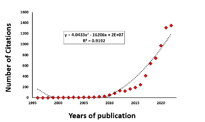 The number of citations acquired from the Web of Science was equivalent to 6508 citations, the distribution of which is illustrated in Figure 2. The year with the most citations was 2022, with 1351 citations, which is appropriate for this era. The citation trend shows that researchers are referring to this topic in more and more papers. This is related to issues such as the novelty and importance of the subject, which have attracted the attention of many researchers. Eq. 1 is a polynomial equation that describes the relationship between the number of citations and the number of years, and it has a correlation of 0.91. This association predicts a rising trend in citations over the next several years. As shown in Eq. 2, Y is the total number of citations, and X is the year.