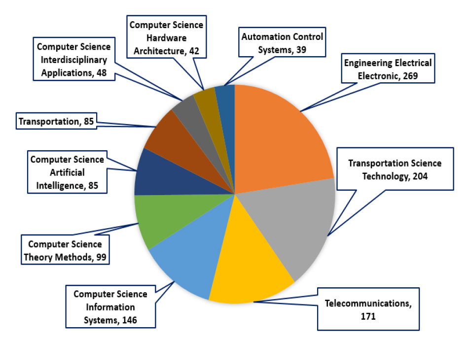Figure 3 displays the distribution of printed material by subject area, with 269 documents pertaining to the subfield of Engineering Electrical Electronic. There have been 204 papers published in the subject of transportation science and technology, making it the second most productive field out of ten based on the web of science categories. Researchers have made direct use of the term "ITS for road safety" in their titles, abstracts, and keywords of publications relating to this issue. Another indicator of academic enthusiasm for applying ITS to traffic security is the high volume of papers published in the area of electrical and electronic engineering. More than half of all technical publications are in the first three categories, which include fields including engineering, electrical and electronic, transportation science and technology, and telecommunications. Meanwhile, over the same time period, a total of 146, 99, 85, and 85 documents were published in the fields of computer science information systems, computer science theory and techniques, computer science artificial intelligence, and transportation, respectively. Since the ITS has a lot of potentials to make roads safer and these four groups cover such a wide range of issues, it was thought that more papers would be written about these topics.